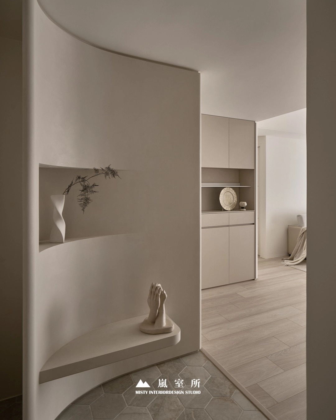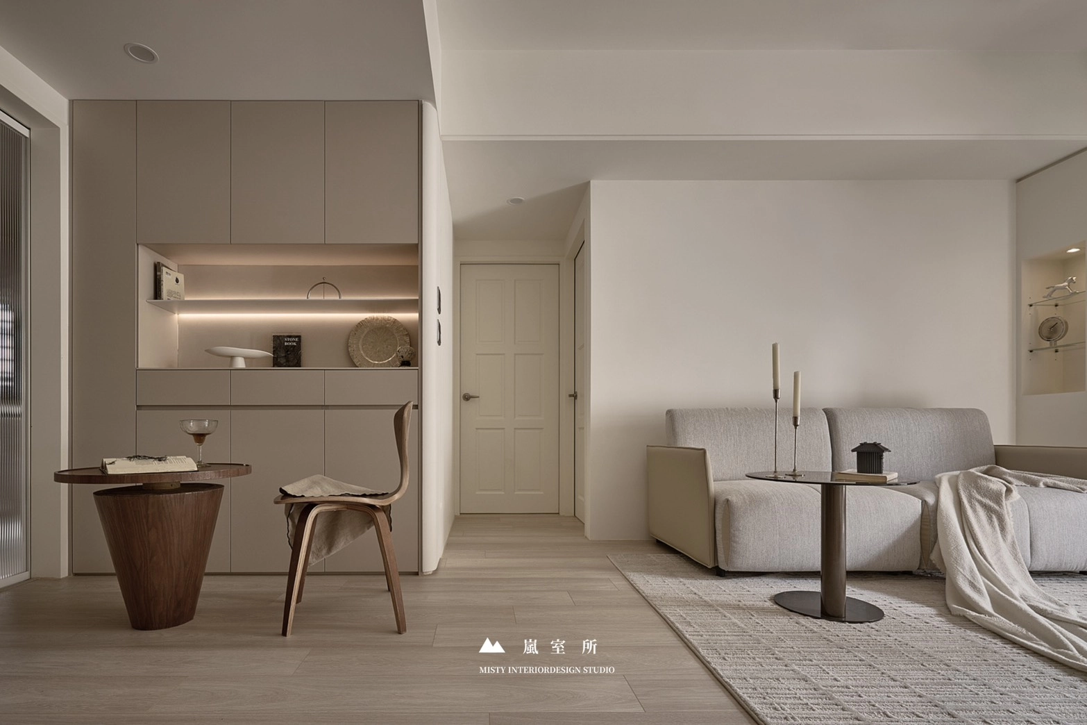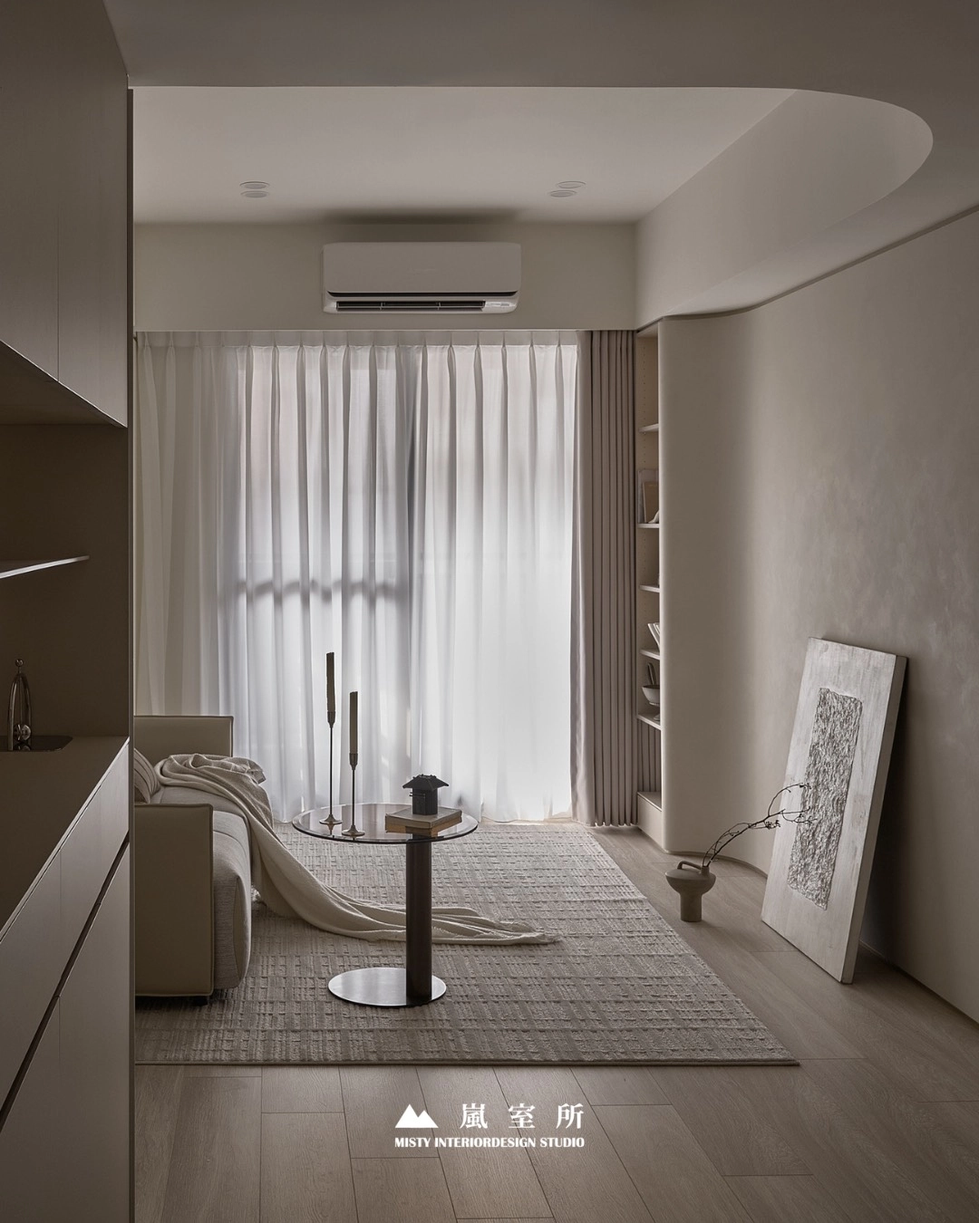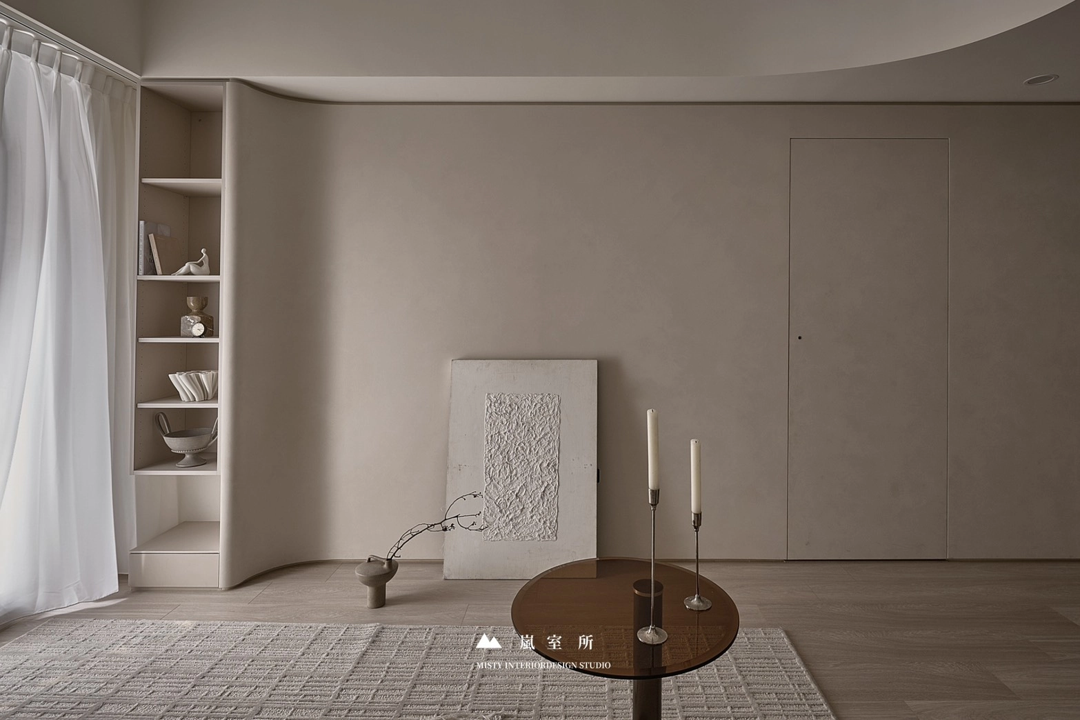 光影溫柔灑落,空間與生活在這裡對話。以米白色與木質調為主軸,構築出如呼吸般流動的氛圍。牆面微弧線條柔化了空間感,家具以低彩度材質呈現,既保留質樸氣息,也讓居住者能自在擁抱每一寸寧靜。