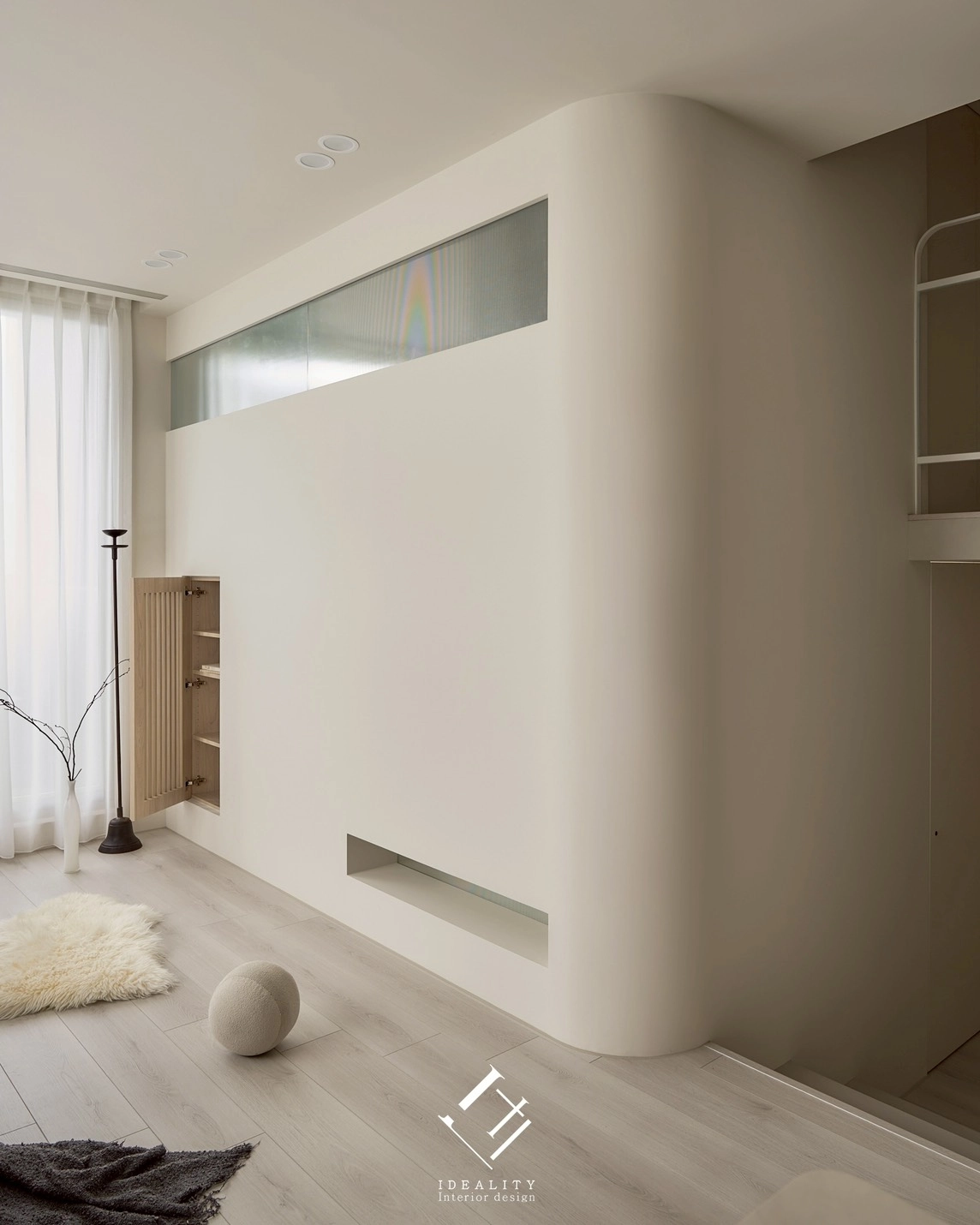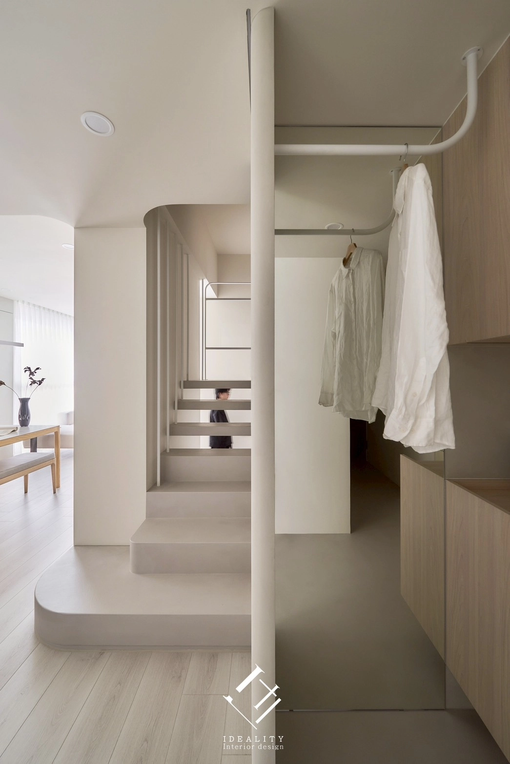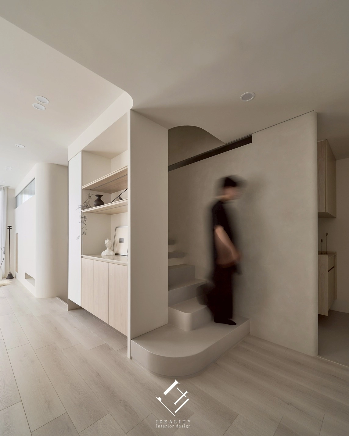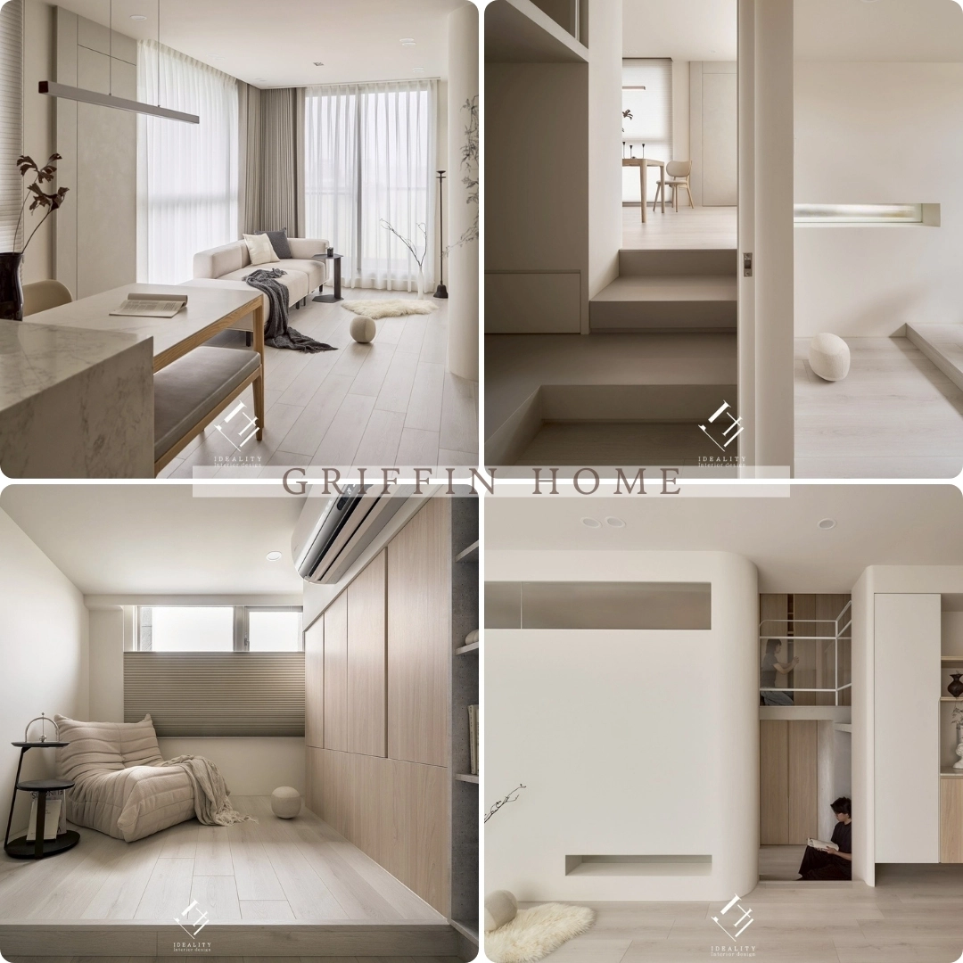 光與影,在這裡成為空間的靈魂。米白色牆面與溫潤木質相互交融,串聯生活的每一段節奏。以極簡線條構築整體格局,讓弧形牆面、階梯與櫥櫃自然過渡,空間因此流動、輕盈。