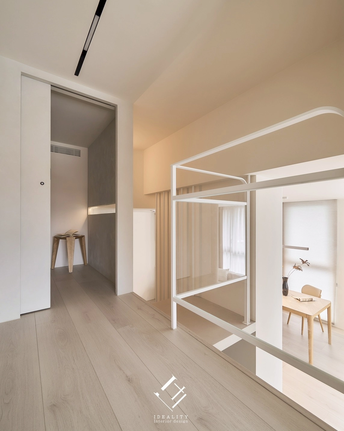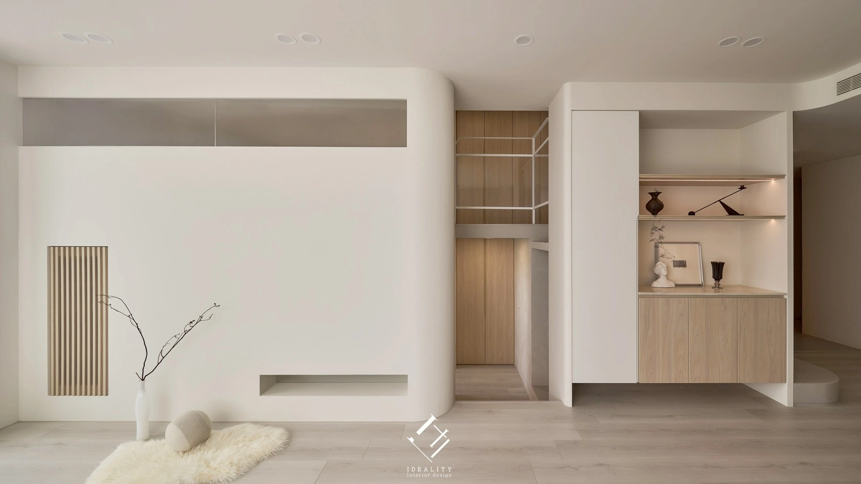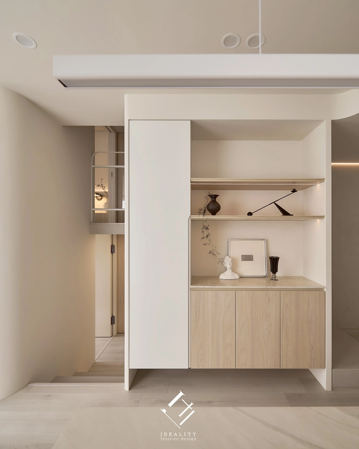 光與影,在這裡成為空間的靈魂。米白色牆面與溫潤木質相互交融,串聯生活的每一段節奏。以極簡線條構築整體格局,讓弧形牆面、階梯與櫥櫃自然過渡,空間因此流動、輕盈。