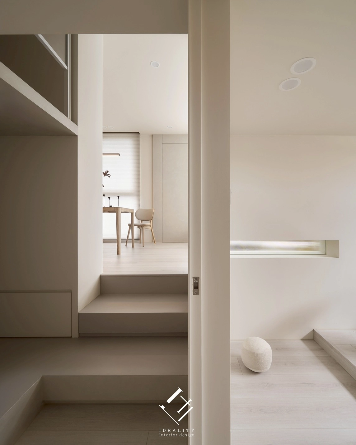 家具選擇低彩度與柔軟材質,搭配細膩的軟裝點綴,既保留視覺上的純淨,也營造細膩的生活溫度。無論是光影灑落的餐桌一角,還是通往二樓的階梯轉折,都呈現一種「慢」的氛圍——讓人卸下日常的紛擾,專注感受生活本身。