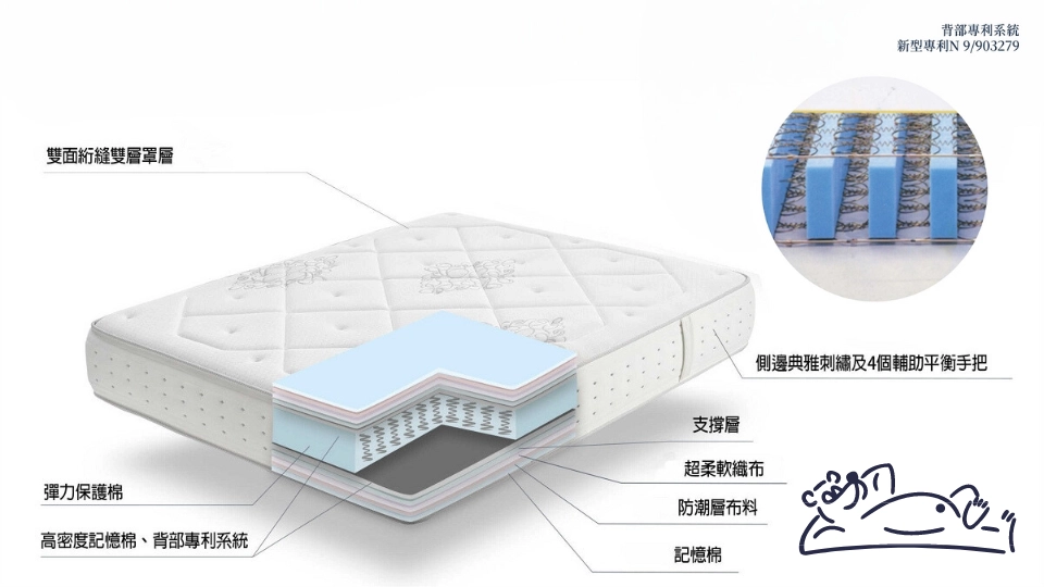 Viscodorsal 採用的Dorsal Patented System記憶棉彈簧系統擁有最佳的結構剛性與支撐力,如果定期翻面與轉向的話,真的是一張可以讓您睡一輩子的好床。